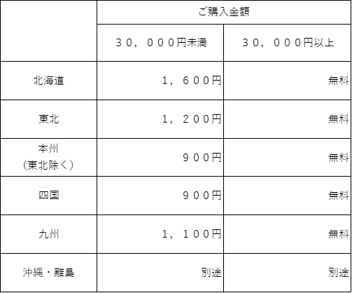ご注文金額合計(税抜)30,000円以上の場合は、送料無料で対応いたします。(沖縄県・離島除く)【下記、地域ごとの送料を参照】